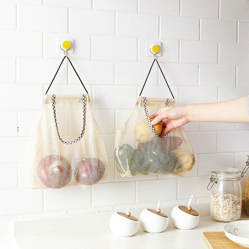 ハンギング メッシュバッグ 2点セット キッチン 吊り下げ 巾着袋 果物野菜 メッシュ素材 通気性 収納袋 フルーツ 収納袋 野菜保存 多機能収納袋