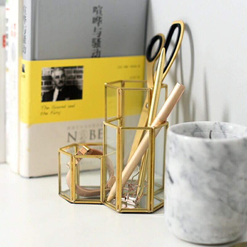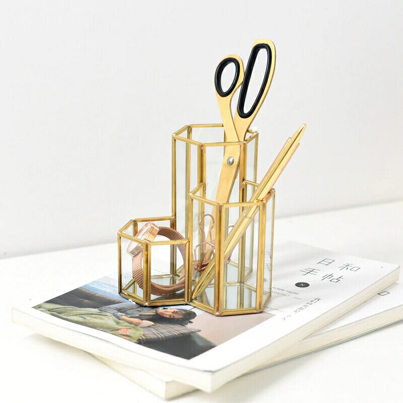 ブラシスタンド コスメ収納 真鍮 ヘキサゴン ガラス スタンド メイクブラシ 収納 北欧 アジアンガラスケース アクセサリー収納 ガラスボックス ディスプレイ おしゃれ