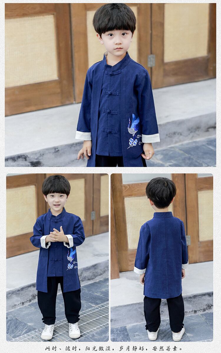 チャイナ 子供服 2点セット表演服 カンフー 太極拳 服 ウェア 男の子 演武服 演武服 チャイナ 太極ウェア 長袖 長拳 伝統拳 気功 前開き 鶴 学園祭