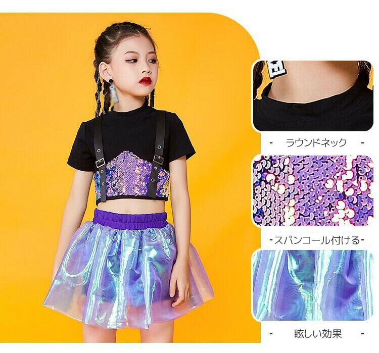 キッズ ダンス衣装 チアガール ダンス衣装 セットアップ ガールズ チアダンス 女の子 ジャズダンス キラキラ スパンコール ヒップホップ トップス スカート 応援団 団体服 演出服
