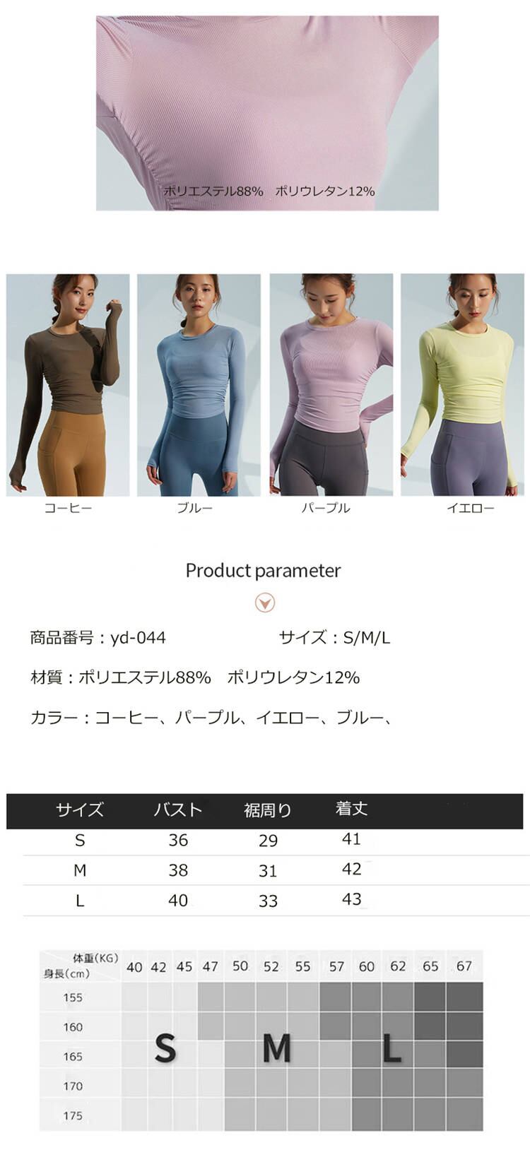 ヨガトップス 長袖 Tシャツ レディーヨガ ピラティス ウェア トップス 豊富な品揃えカラー: コーヒー ブルー パープル イエロー サイズ: S M L