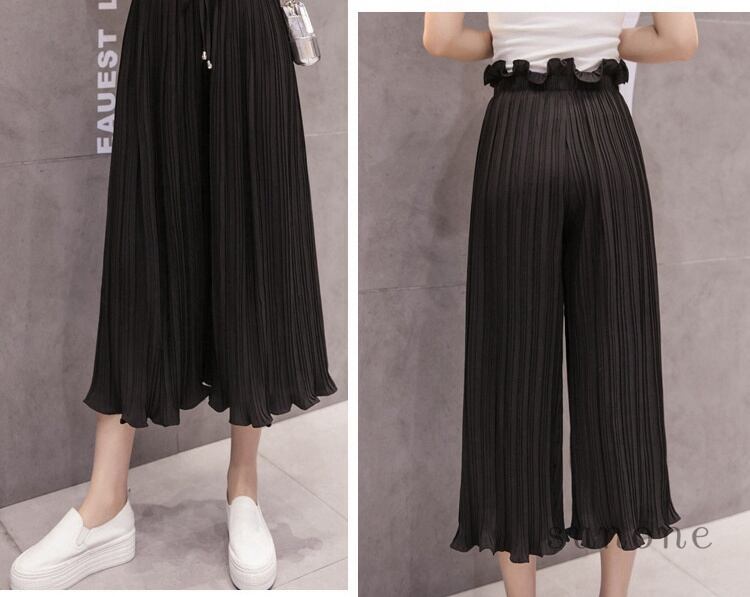 9分丈ズボン パンツ レディース 春 夏 プリーツ シファン フレア 個性的 ウエストゴム Aライン 体型カバー かわいい 女性 無地 おしゃれ シンプル きれ