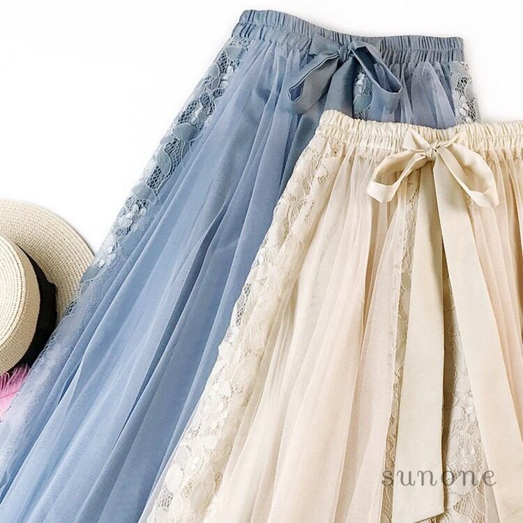 レディース スカート チュールスカート ロングスカート ボトムス ロング丈 ウエストリボン 体型カバー オシャレ お出かけ 人気 大きいサイズ 可愛い ファション カジ